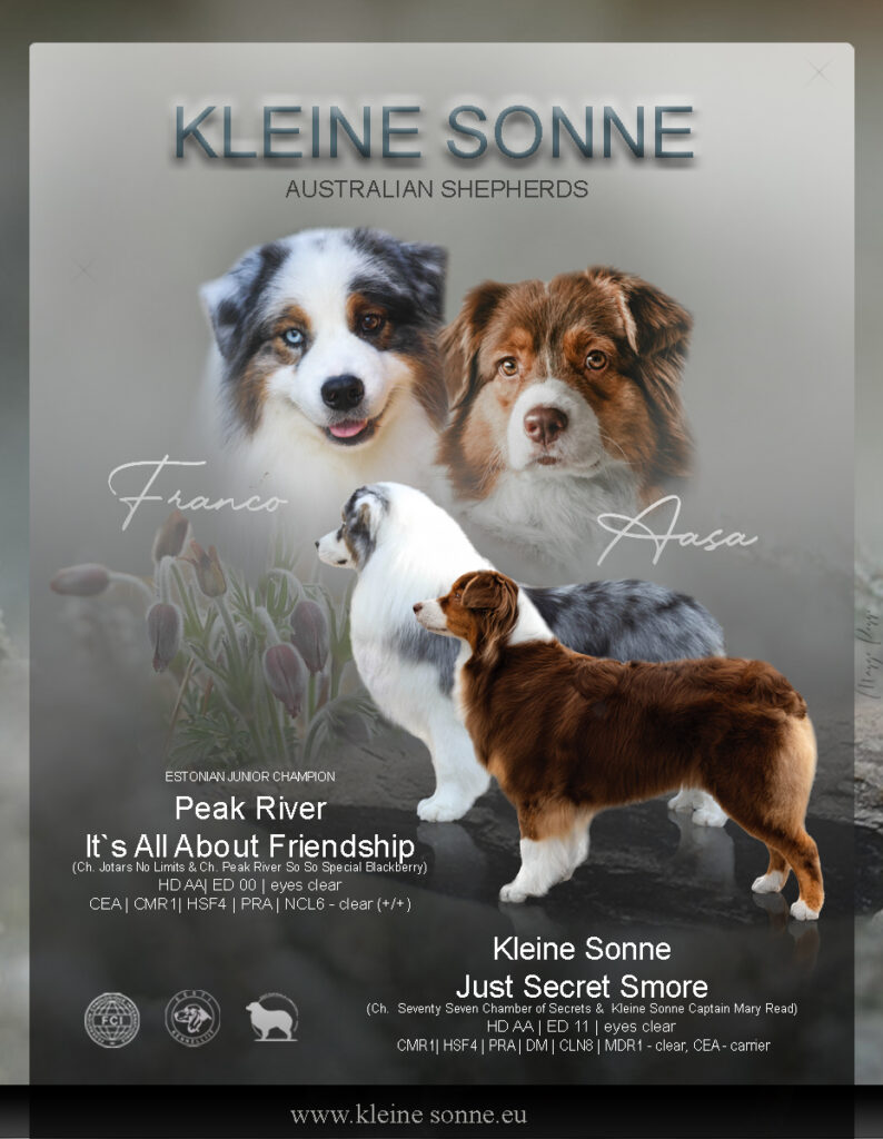 | Terviseuuringud: | CEA – SG: partner lab MUT/WT Carrier DM – SG: SOD1 exon2 – partner lab N/N (G/G) Clear PRA-prcd N/N non-affected MDR1 N/P (+/-) carrier CMR1 N/N Non-affected HSF4/HC N/N Non-affected |